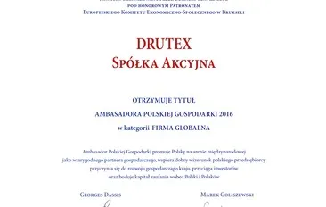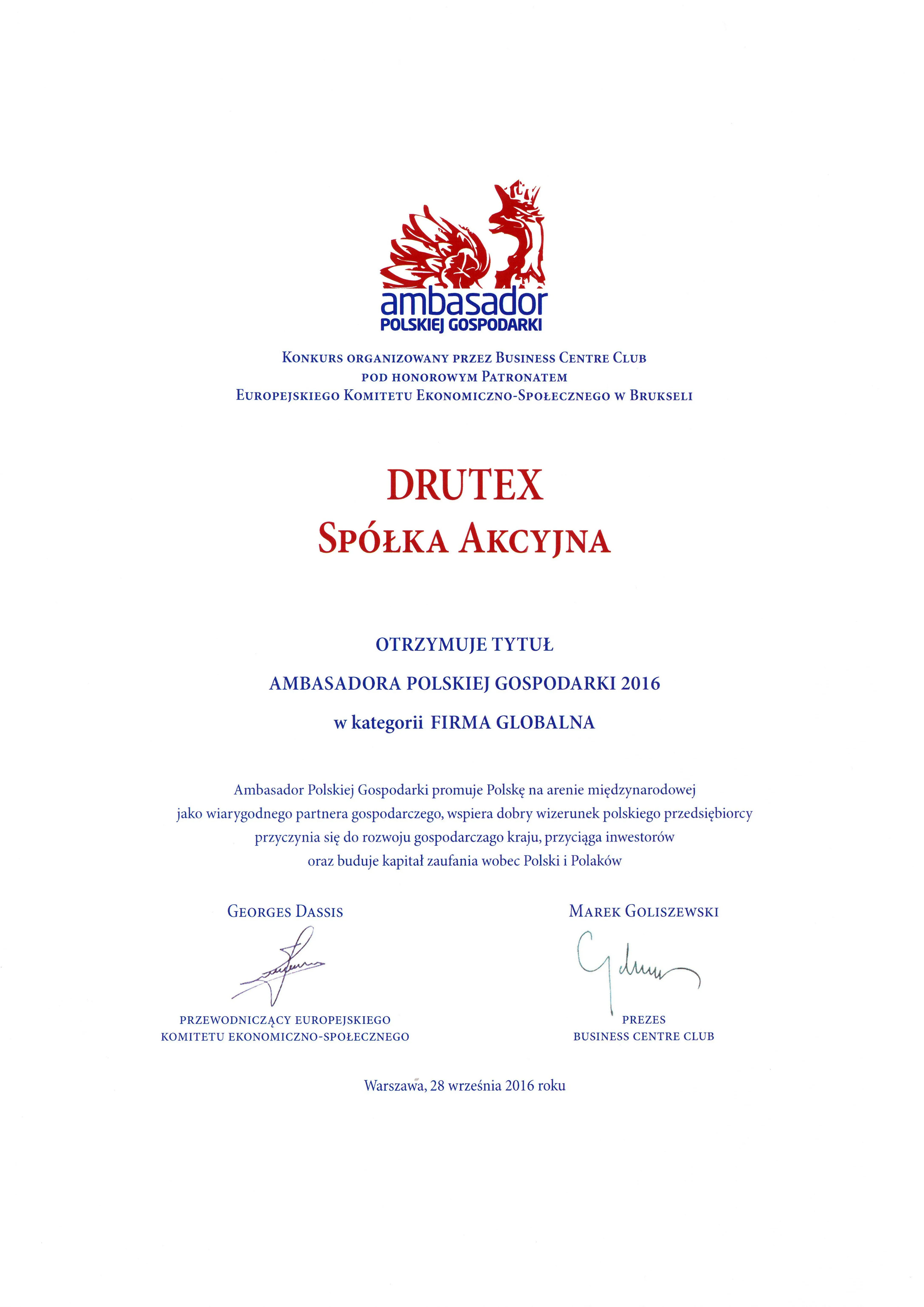 DRUTEX został laureatem 8.edycji konkursu Ambasador Polskiej Gospodarki w kategorii „Firma Globalna”. Konkurs organizowany jest przez Business Centre Club pod honorowym patronatem Europejskiego Komitetu Ekonomiczno-Społecznego w Brukseli.