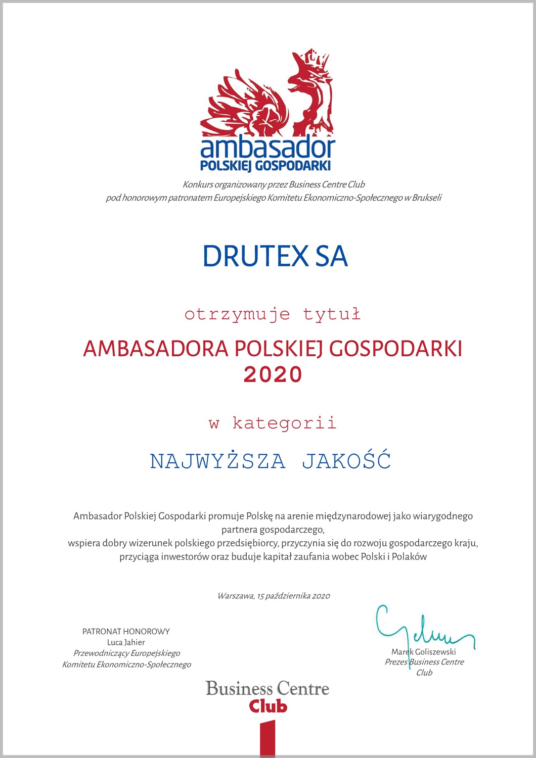 Drutex a été honoré pour l’excellente qualité de ses produits vendus dans le monde entier. La société a obtenu le titre d’Ambassadeur de l’économie polonaise dans la catégorie « Meilleure qualité ». Le concours, organisé par le Business Centre Club, était parrainé par le Comité économique et social européen de Bruxelles.