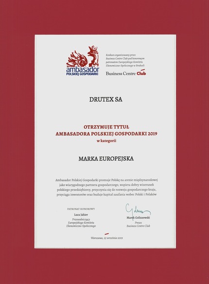 La société Drutex a reçu cette distinction en reconnaissance de ses succès et de son développement dynamique sur les marchés internationaux et pour la promotion de la Pologne à l’étranger. Cette année, Drutex a reçu ce titre prestigieux dans la catégorie Marque Européenne. Cette distinction récompense les entreprises dont l’activité est bien connue en Europe non seulement parce qu’elles sont polonaises mais, tout simplement, parce que les produits et les services qu’elles proposent en Europe se distinguent par leur excellente qualité.