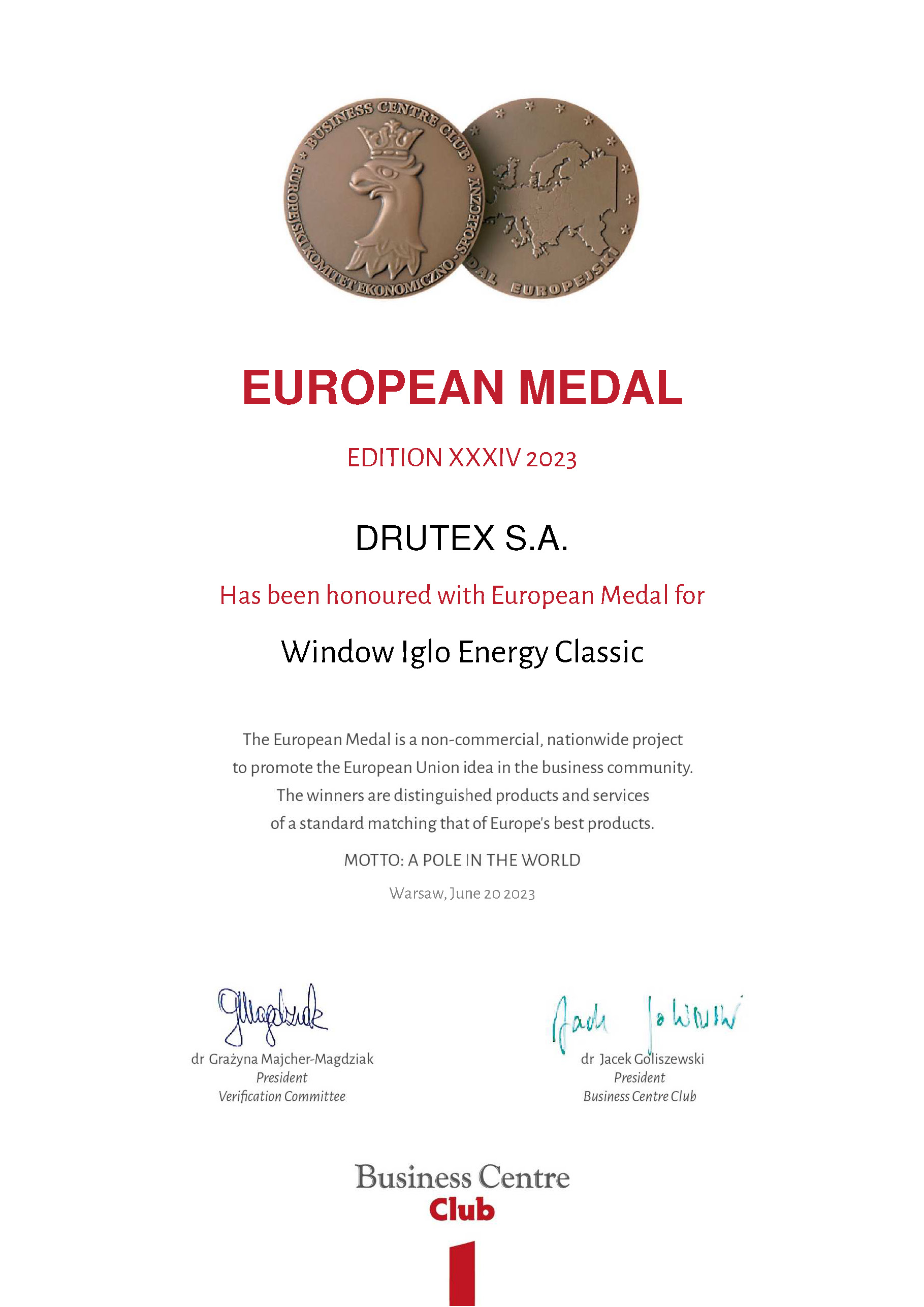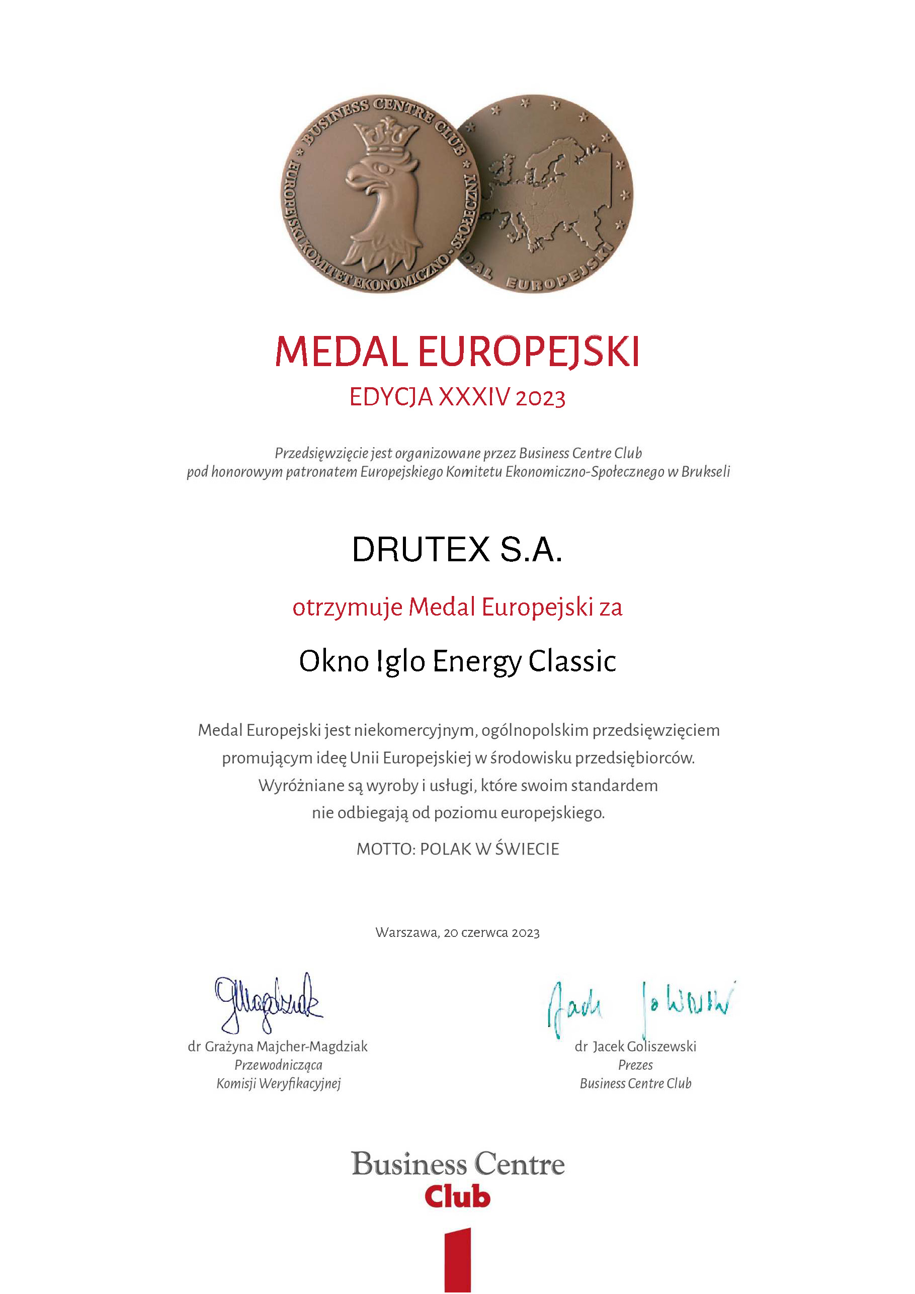 Une fois de plus, DRUTEX S.A. a reçu la Médaille européenne dans le cadre du prestigieux concours organisé par Business Centre Club. Cette fois-ci, l'un des leaders du marché européen de la menuiserie de portes et fenêtres a été distingué pour la fenêtre Iglo Energy Classic.