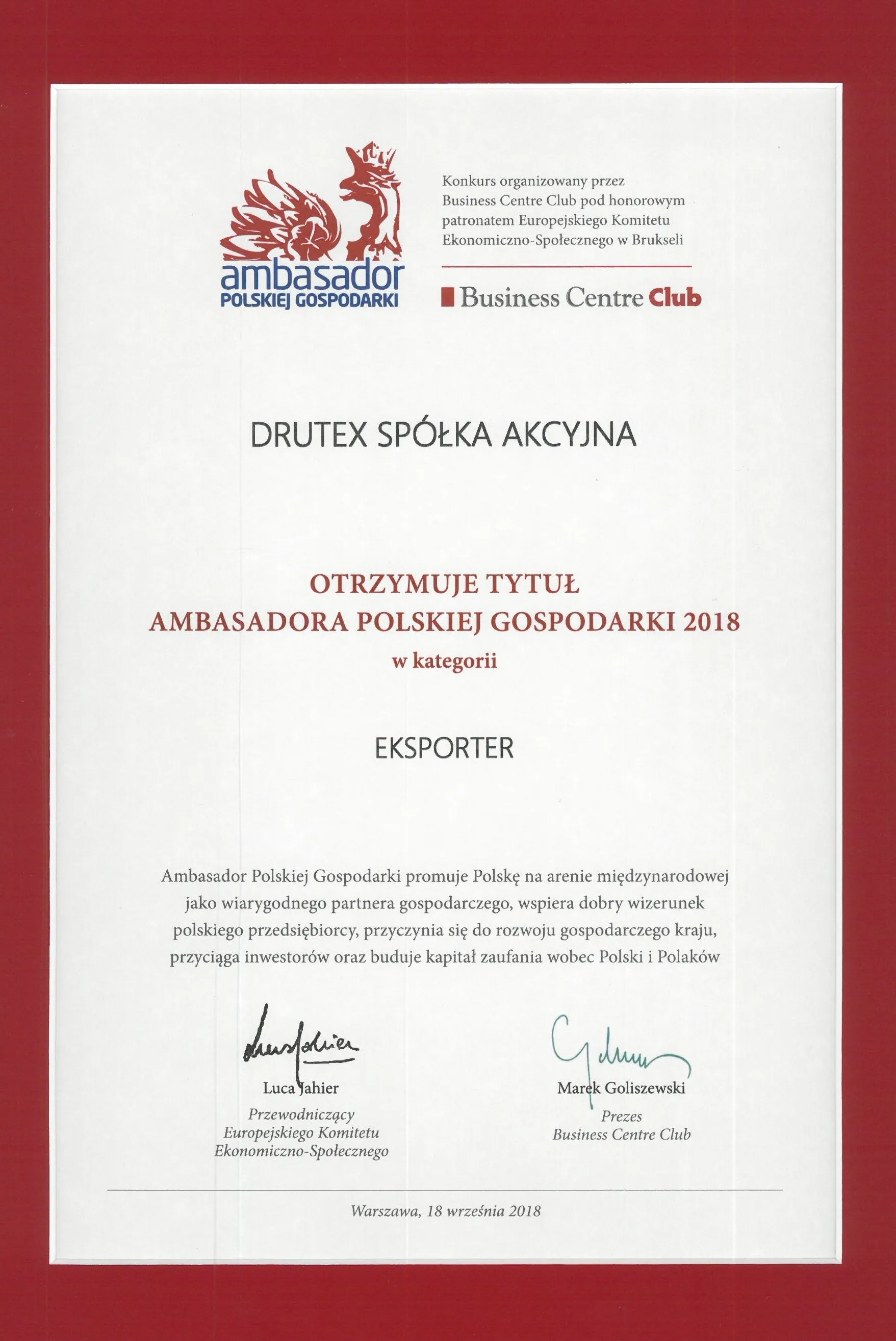 Organisé par le Business Centre Club sous le patronage d’honneur du Comité social et économique européen de Bruxelles, le concours de l’ « Ambassadeur de l’économie polonaise » a pour tâche d’augmenter l’engagement des entrepreneurs polonais dans la promotion de la Pologne sur la scène internationale en tant que partenaire économique fiable. La société Drutex a été distinguée pour ses succès et son dynamisme sur les marchés étrangers ainsi que pour la promotion de la Pologne à l’étranger. Depuis des années, l’entreprise élargit systématiquement son champ d’action et renforce sa participation au marché international de la menuiserie. Grâce à son offre riche en produits adaptés à la spécificité des différents marchés internationaux, Drutex connaît chaque année une croissance des ventes à deux chiffres et gagne la confiance d’un groupe toujours plus important de partenaires commerciaux. Plus de 4000 entreprises du monde entier collaborent désormais avec Drutex et la société peut se vanter de nombreux projets prestigieux, ne serait-ce que la menuiserie dont elle a équipé l’usine Lego au Mexique ou encore les hôtels américains Marriott, Hilton et Holiday Inn.