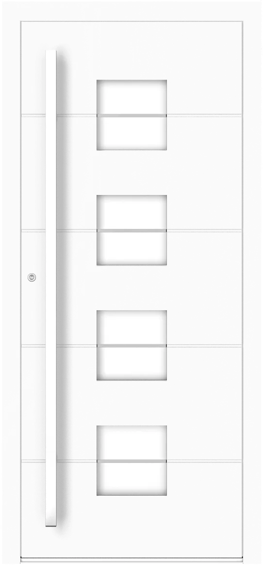 Les portes extérieures en aluminium fabriquées dans ce système sont équipées d'un seuil en aluminium à rupture de pont thermique en standard, elles se caractérisent non seulement par des valeurs exceptionnelles en termes d'isolation thermique, mais également de durabilité. Recommandées pour le bâtiment efficace sur le plan énergétique. Equipement standard: